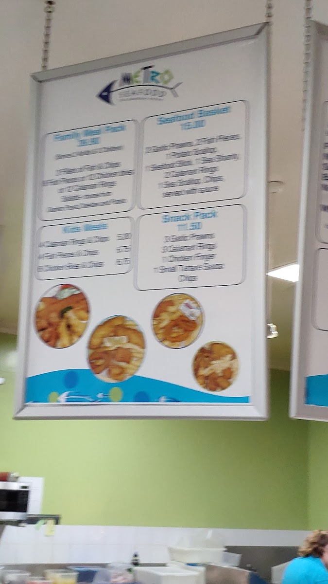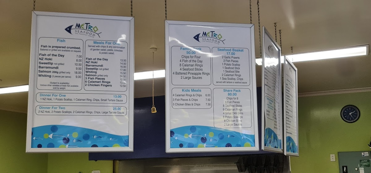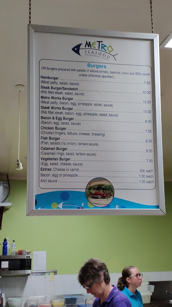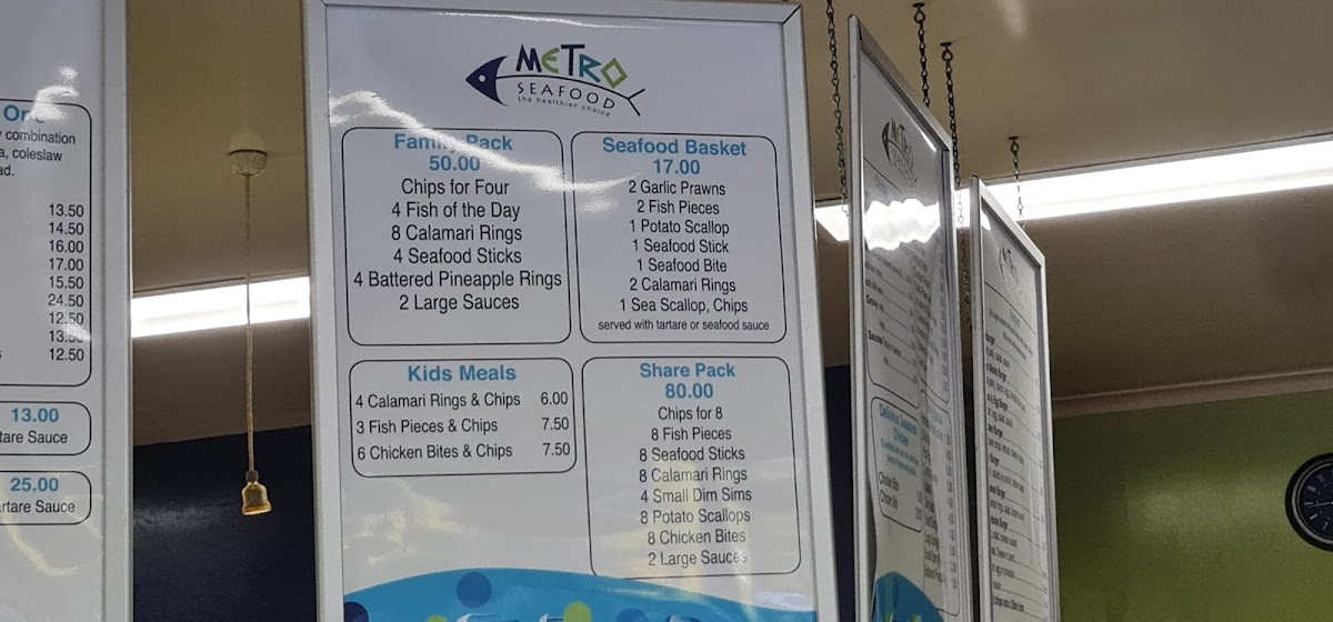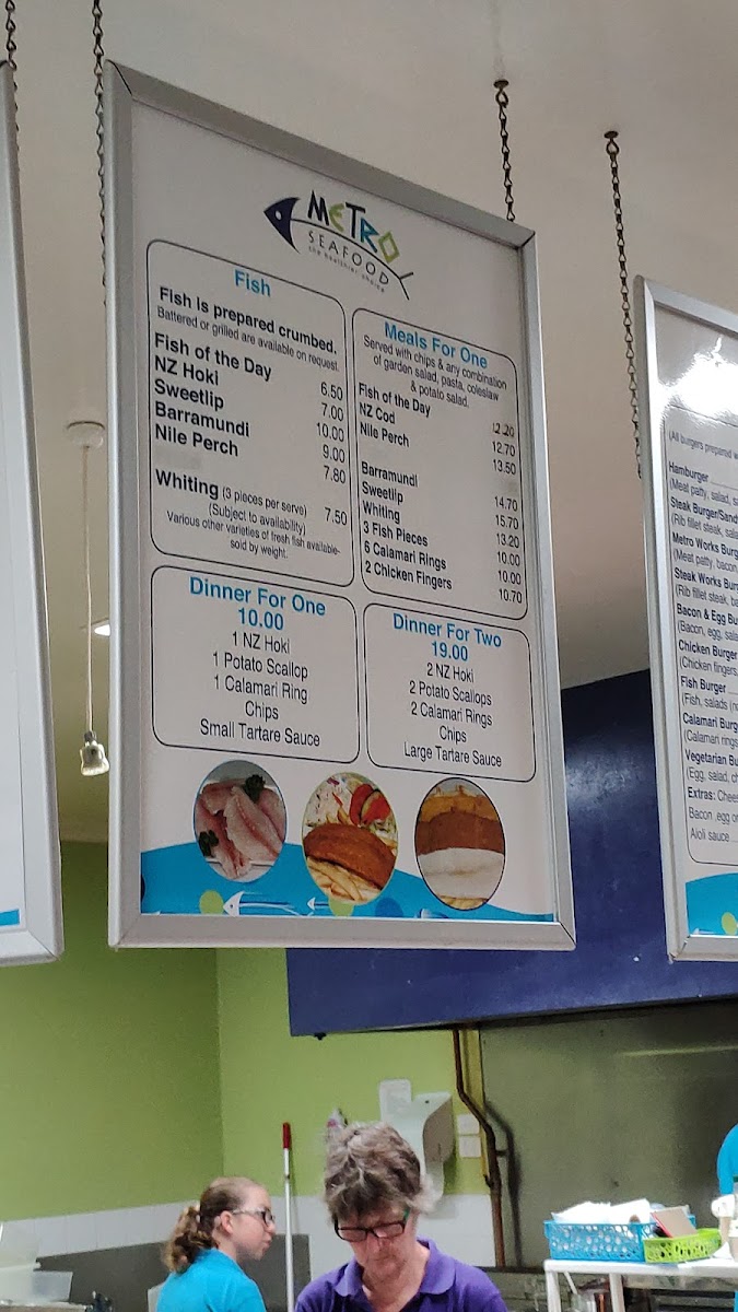 Overall, the menu at Metro Seafood offers a straightforward yet satisfying selection that caters to a wide range of tastes, making it a reliable choice for casual dining. The burger lineup, featuring options like the Hamburger, Metro Works Burger, Bacon And Egg Burger, Chicken Burger, and Fish Burger, provides hearty alternatives for those seeking something beyond seafood. Meanwhile, the fish selection stands out with staples such as Barramundi, Whiting, Salmon, and the convenient 3 Fish Pieces, all reflecting the restaurant’s focus on fresh, classic flavors. Snack lovers will appreciate quick bites like the Potato Scallop, Fish Piece, Chiko Roll, Seafood Bite, and Pluto Pup, perfect for a light indulgence. For families, the kids’ meals-4 Calamari Rings & Chips, 3 Fish Pieces & Chips, and 6 Chicken Bites & Chips-offer balanced portions that are both appealing and practical. Additional items like Sweet Potato Chips, Gravy, Fish Of The Day, Nz Hoki, and the generous Seafood Basket round out the menu, ensuring there’s something for everyone. Altogether, the menu feels well-curated, combining familiar favorites with seafood highlights in a way that’s both accessible and satisfying.